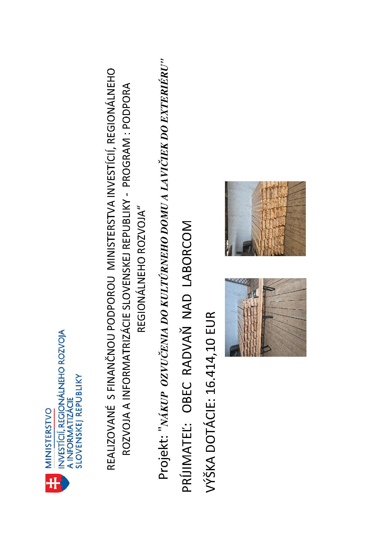 Projekt: "Nákup ozvučenia do kultúrneho domu a lavičiek do exteriéru" bol zrealizovaný s finančnou podporou Ministerstva investícií, regionálneho rozvoja a informatizácie Slovenskej republiky - program: Podpora regionálneho rozvoja.