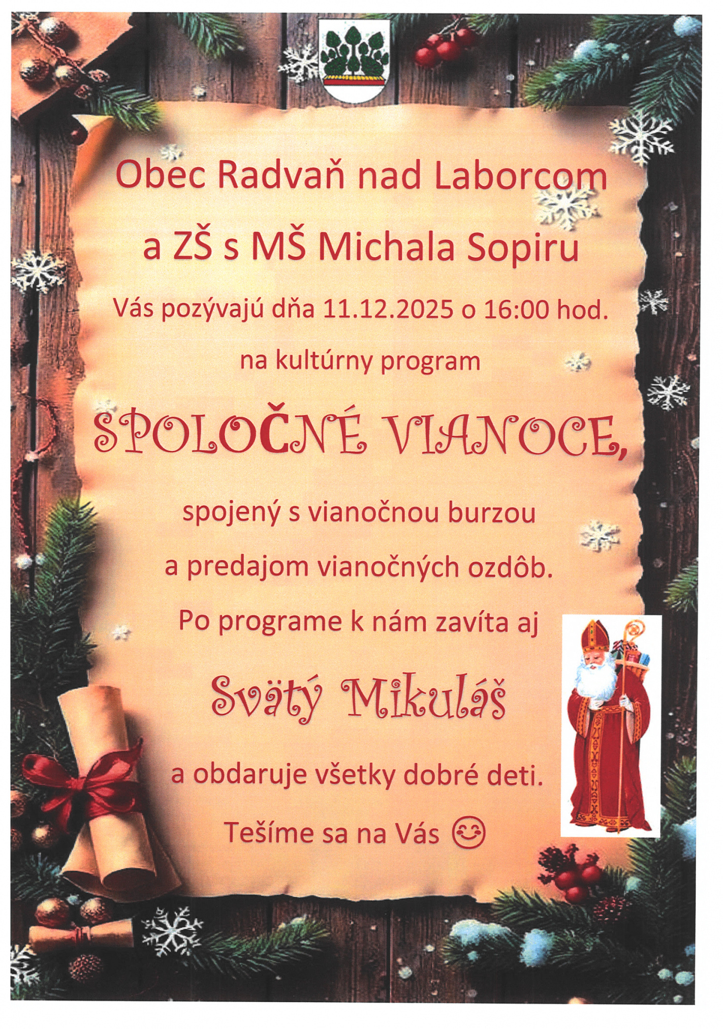 SPOLOČNÉ VIANOCE, spojené s vianočnou burzou a predajom vianočných ozdôb. Príde aj Mikuláš! Srdečne všetkých pozývame :)