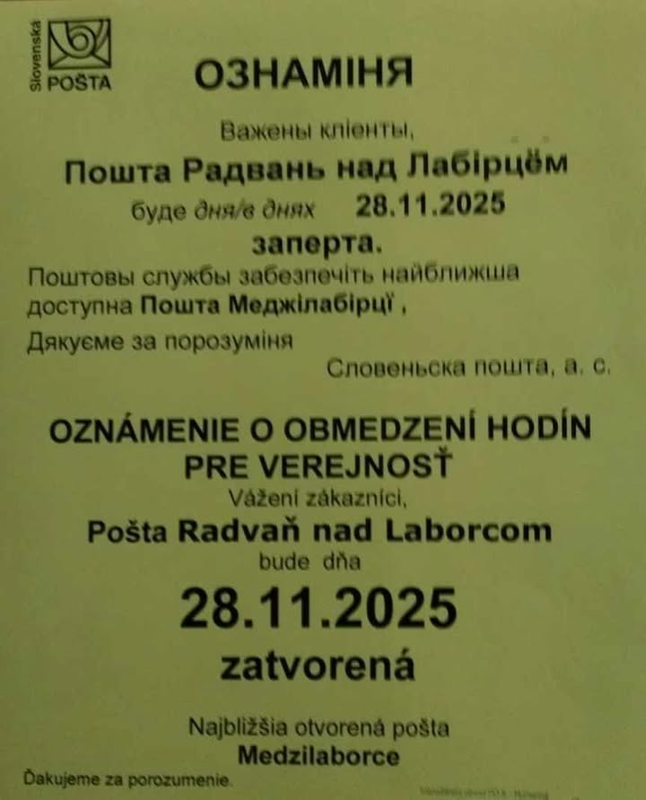 Dnes 27.11.2025 bude pošta zatvorená celý deň